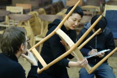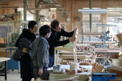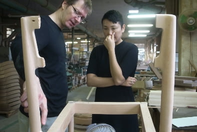 木工では無理と思えることを可能にするのがイノダ・スバイエらしさともいえます。しかし、材料や接合のことなど無視しているような印象の造形であっても、材料や構造のこともしっかり考えていることをワークショップを通じて感じました。不自然な木の接ぎ方や、接着剤に頼ることは決して良しとしません。二人がミラノから宮崎椅子製作所にやってくるときは 3、4日くらい滞在しますが、その間、試作の検証・改良のために工場で私たちスタッフと一緒にずっと木を削っている、そんな印象です。